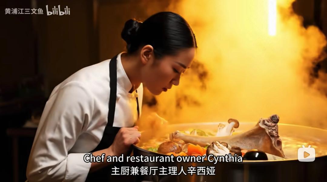 黄浦江三文鱼:也是根据前几次的作品来的,这些厨师炒菜的时候,我有一些没注意到,他手就会在明火上面穿来穿去。但当时给我的感觉,这个画面一来,大家就开始弹幕刷起来说穿帮、无情铁手什么的,我就想之后在这种方面适当加一些AI的穿帮,也会让大家觉得不是实拍。