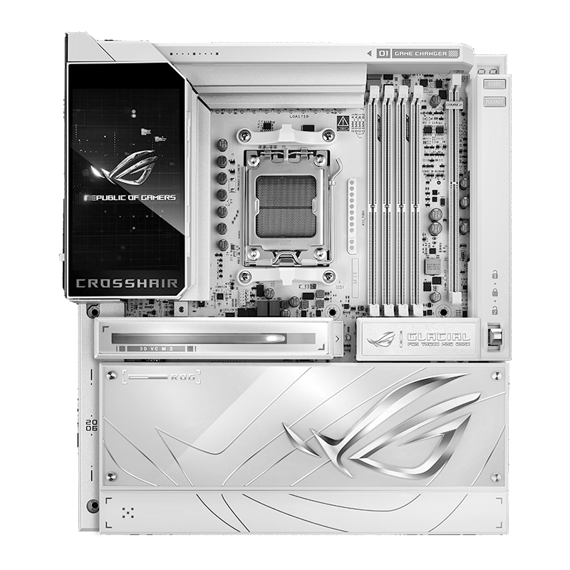 ▲ ROG CROSSHAIR X870E GLACIALROG CROSSHAIR X870E GLACIAL 这款旗舰型号采用纯白美学设计,左上角配备 5 英寸 LCD 显示屏。其搭载 24+2+2 相供电,通过两张扩展卡最多可提供 7 个 M.2 接口,具备双 10GbE 有线网口。