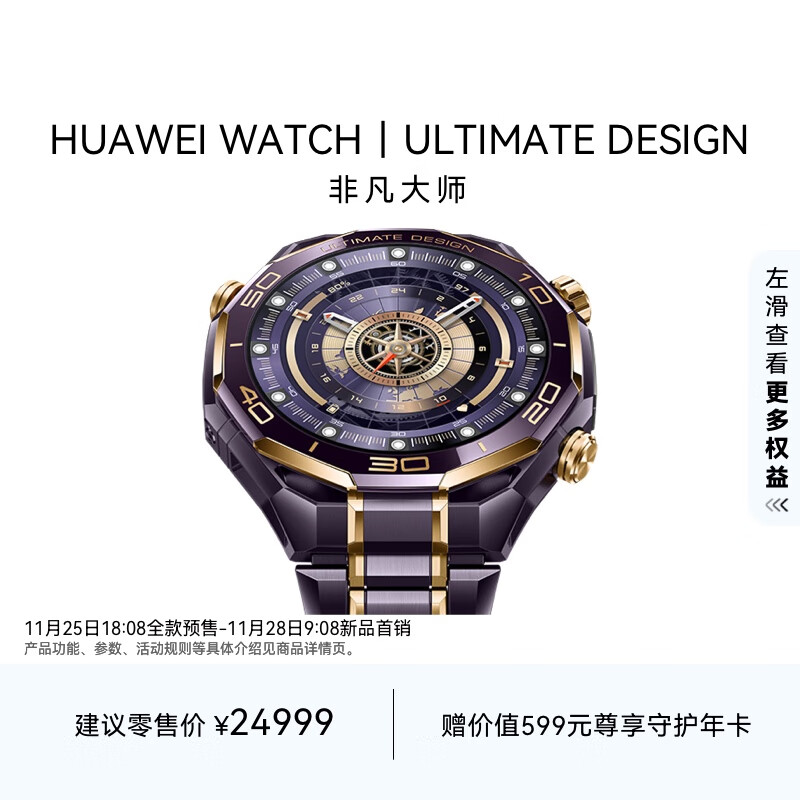 IT之家 11 月 28 日消息,华为 WATCH ULTIMATE DESIGN 非凡大师手表新增“紫金”配色将于今日 9:08 开售,主打非凡设计,拥有十段 18K 金条、24K 镀金表带等旗舰设计,售价 24999 元。