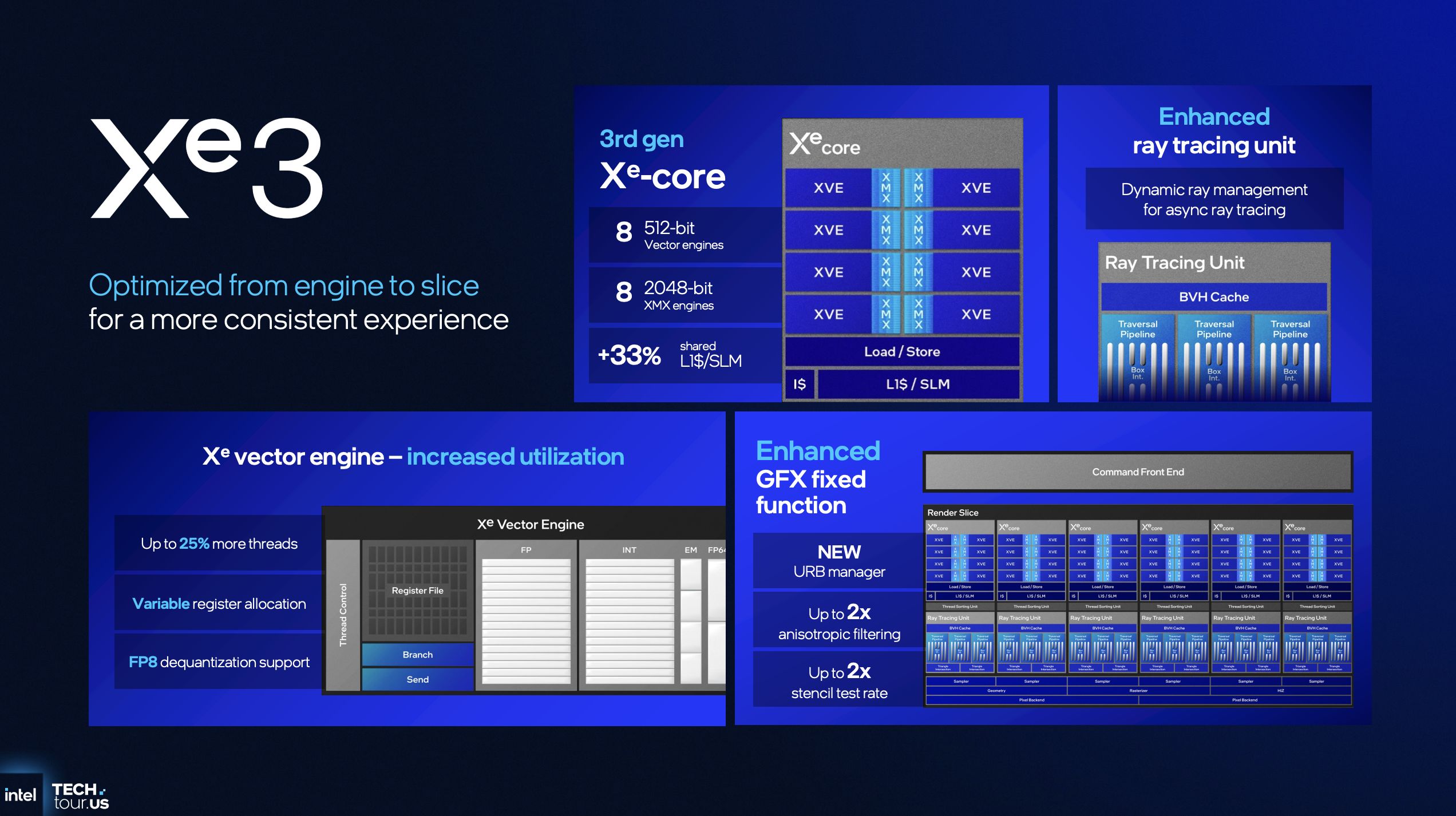Panther Lake的GPU Tile采用全新Xe3架构,提供4 Xe核心与12 Xe核心两种配置。12 Xe核心版本的核心参数堪称亮眼:核心频率提升至2.8GHz(较上一代8 Xe核心提升30%),L1缓存容量翻倍至96KB/核,L2缓存从3MB扩充至6MB。英特尔显卡事业部总经理Raja Koduri在演示中对比了《赛博朋克2077》的运行表现:Arrow Lake在1080P高画质下帧率为45FPS,Panther Lake则直接飙升至90FPS,且画面细节更丰富