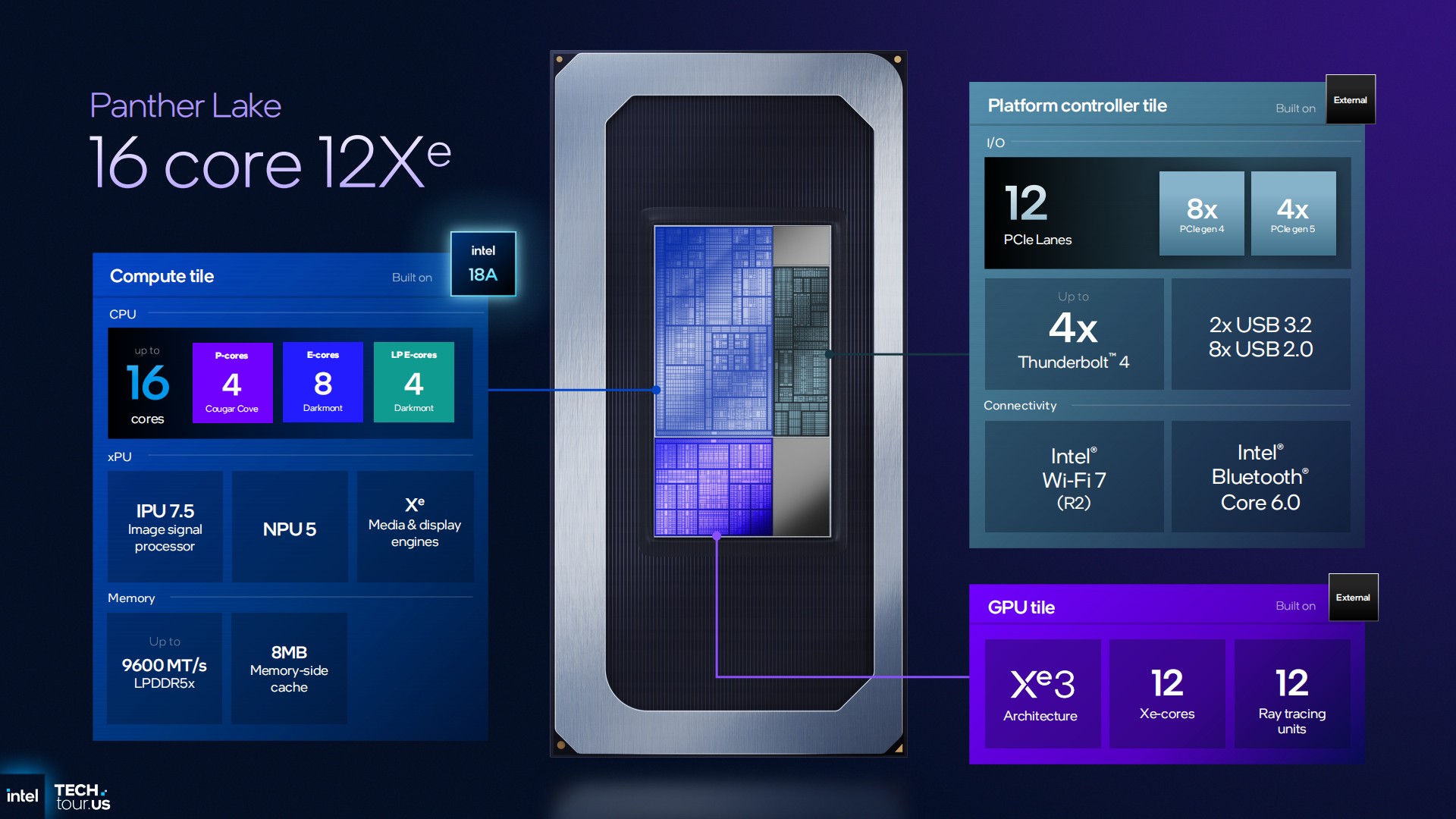 活动现场,一块拆解Panther Lake内部结构的展板,直观呈现了其“模块化异构”的设计逻辑。基于Foveros 2.5D封装技术,Panther Lake将计算、图形、I/O等核心功能拆解为独立Tile(模块),再通过硅中介层(Interposer)实现高速互联,数据传输延迟较传统封装降低40%,同时功耗减少25%。