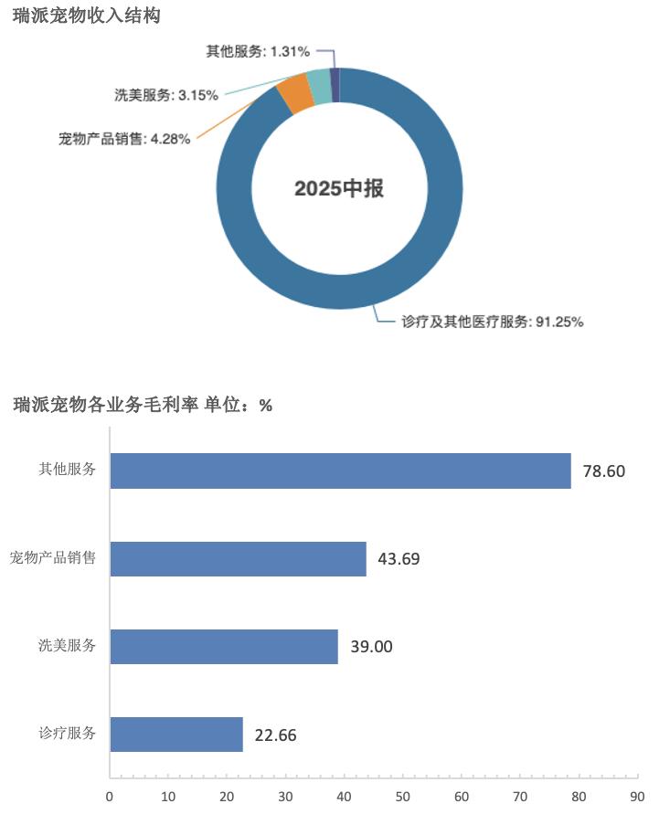 宠物产品销售和洗美服务这两项业务的毛利率虽然相对较高,2025H1分别录得44%和39%;但二者合计收入在同期的收入占比只有个位数,对提升公司整体盈利能力的帮助十分有限。