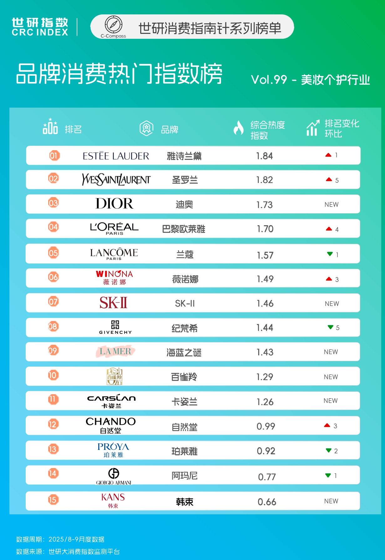 本次监测周期内,美妆护肤品牌雅诗兰黛、圣罗兰和迪奥分别以1.84、1.82、1.73的综合热度位列榜单综合热度前三。