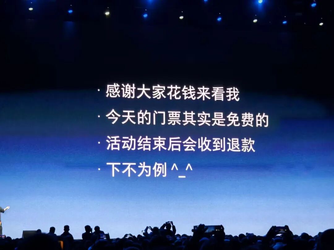但在活动中场,罗永浩在演讲中场用无人机做了个“彩蛋”,并宣布将会把观众门票费用全部退还,并将以观众的名义,将166.84万元的门票收入全部捐给香港「大埔宏福苑援助基金」。
